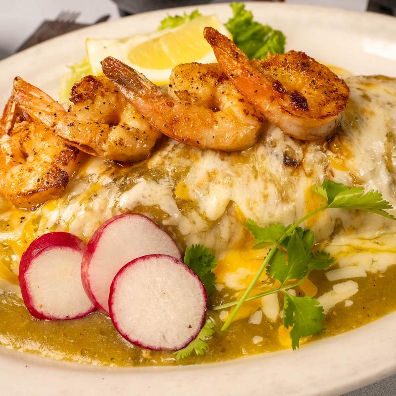 A burrito filled with flatmeat steak, black beans, rice, and cheese. Topped with green tomatillo sauce, melted cheese, and 4 jumbo shrimps.
