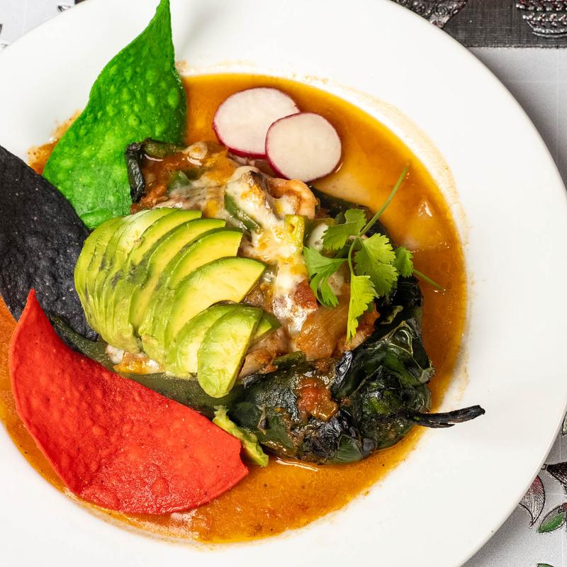 One roasted poblano pepper stuffed with shrimp, and crabmeat. mushrooms, bell peppers, onions, ranchera sauce, melted cheese, and avocado slices on top.